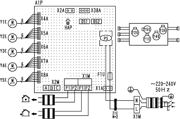 En cuanto al cableado para la unidad interior (F1) - (F2) y la unidad exterior (F1) - (F2) en X1M(A1P), consulte el manual de instalación.